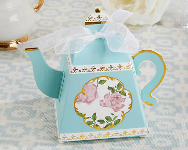 - Aqua teapot-shaped cardstock favor box with 3-D spout and handle features a delicate floral design in the center of the teapot, gold foil details, and a white organza ribbon